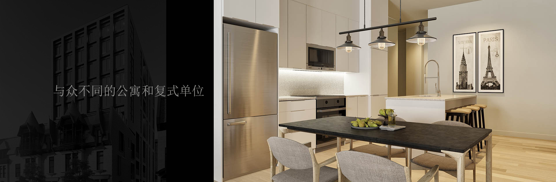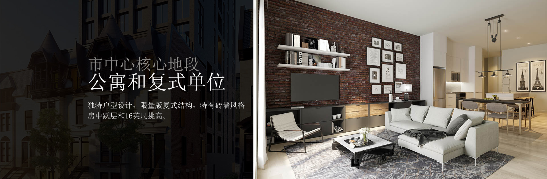 户型设计独特,限量版复式结构,特有砖墙风格,房中跃层和16英尺挑高;超大落地窗确保充足采光和一流视野。户型有开间,一居室和两居室,外加装修精细简约的欧式风格厨房以供选择。